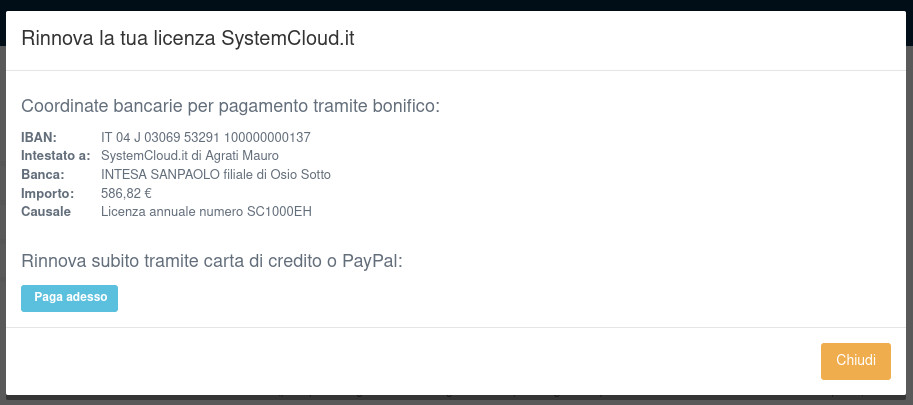 Al click appare la schermata contenente le coordinate per effettuare il pagmanento tramite bonifico bancario ed il pulsante per effettuare il pagamento immediato tramite carta di credito o PayPal