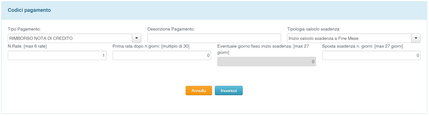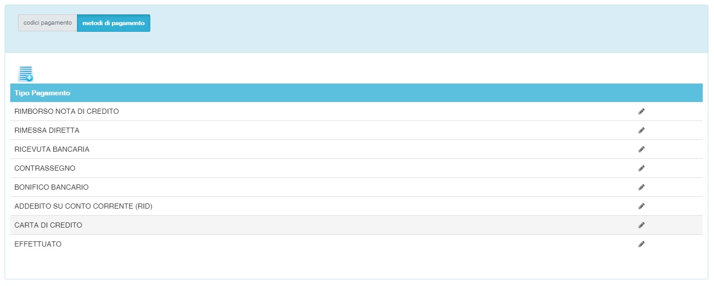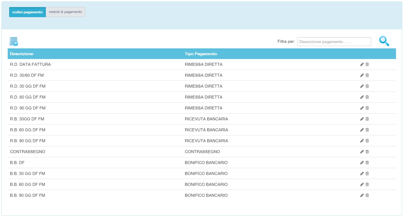 Nella schermata vengono visualizzati i codici pagamento inserite a sistema, attraverso il menù "Azioni" è possibile modificare o eliminare quelli non necessari (solo se non già impiegati nei documenti di vendita)