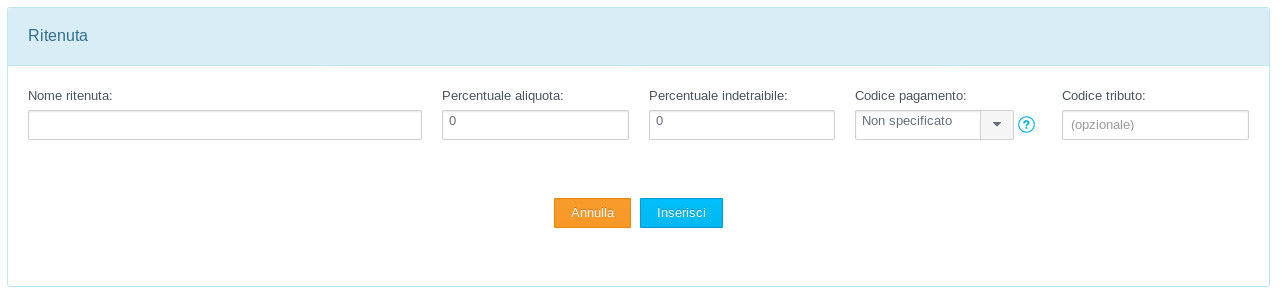 Per procedere con l'inserimento di una nuova ritenuta cliccare sul pulsante "Crea nuova ritenuta"
