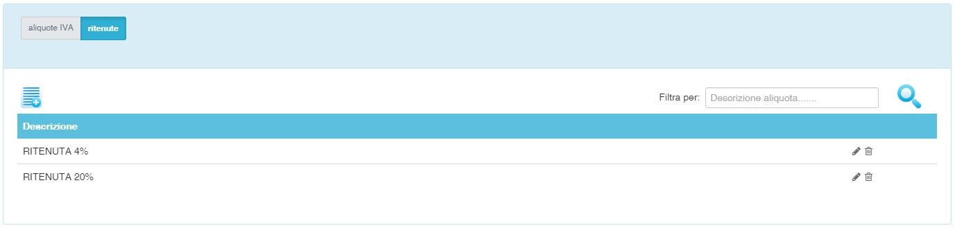 Nella schermata vengono visualizzate tutte le ritenute inserite a sistema, attraverso il menù "Azioni" è possibile eliminare quelle non necessarie (solo se non già utilizzate nei documenti)
