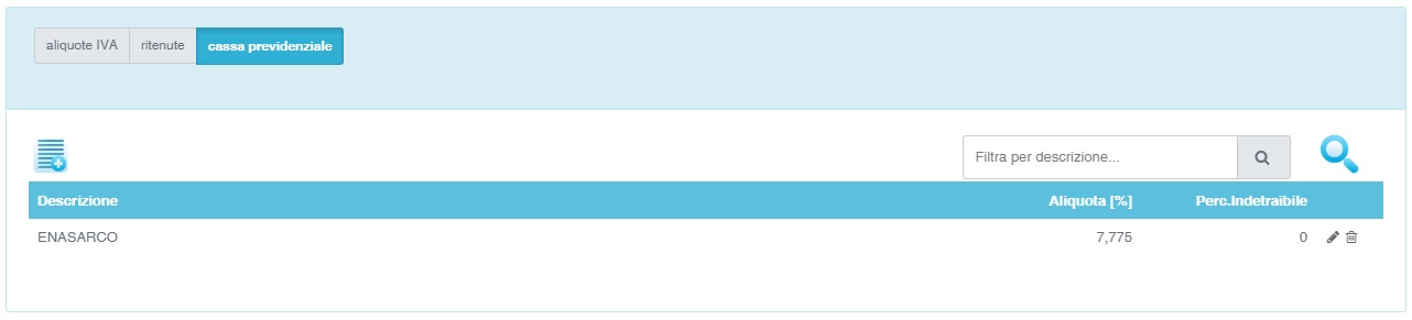 Nella schermata vengono visualizzate tutte le casse previdenziali inserite a sistema, attraverso il menù "Azioni" è possibile eliminare quelle non necessarie (solo se non già utilizzate nei documenti)