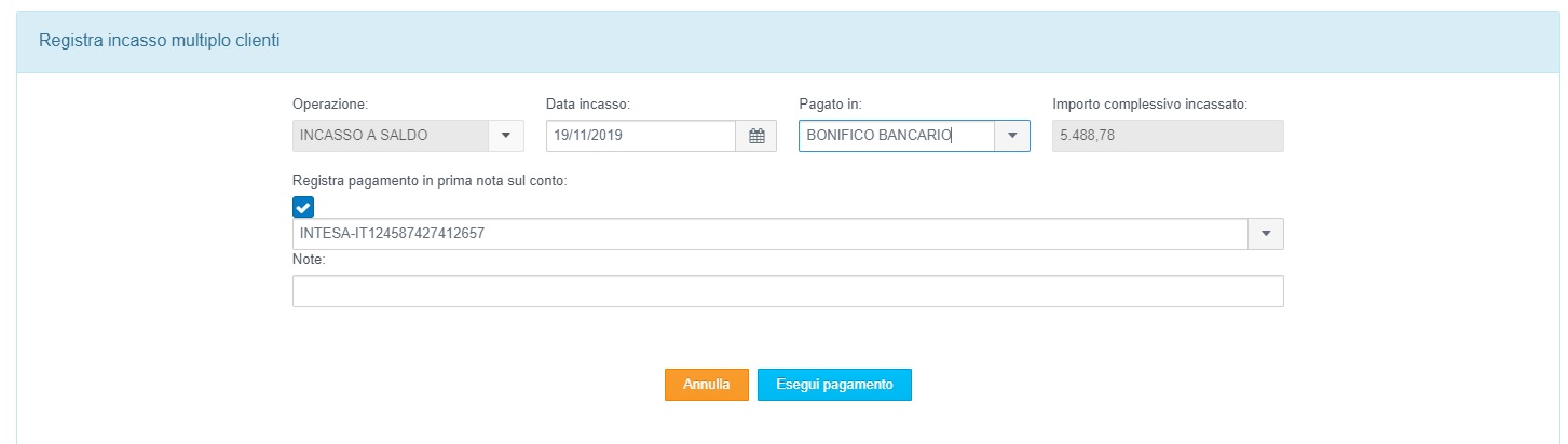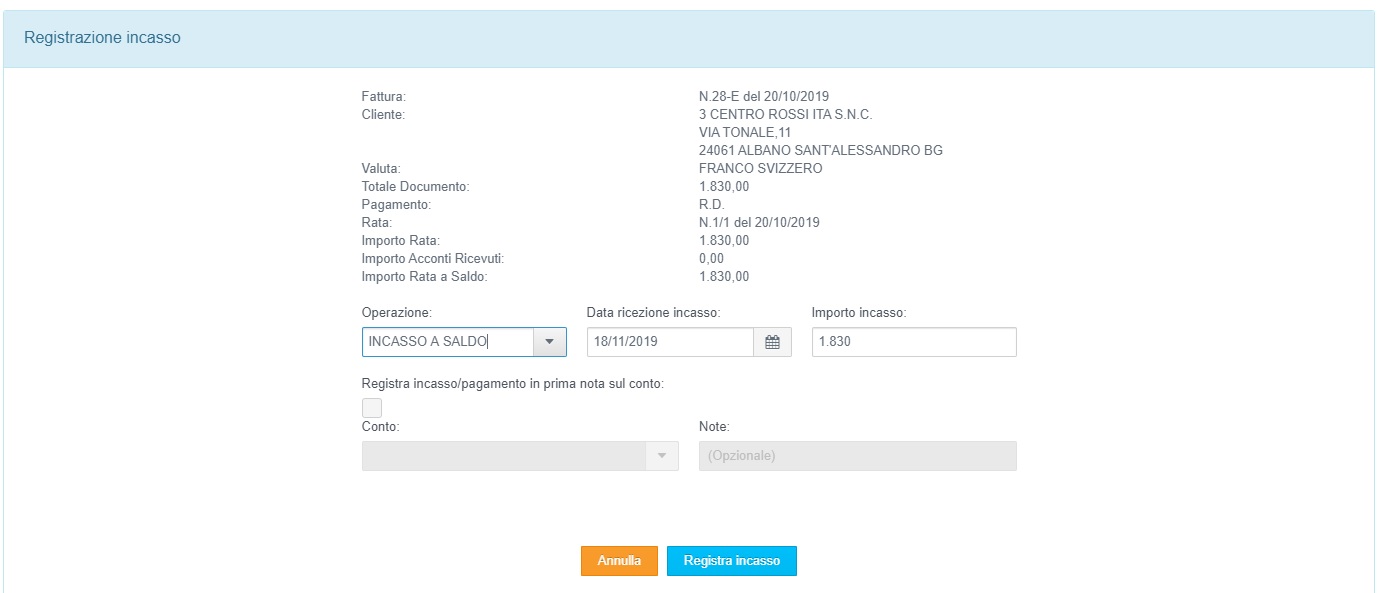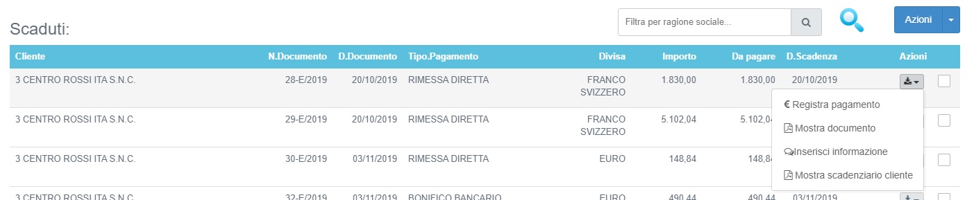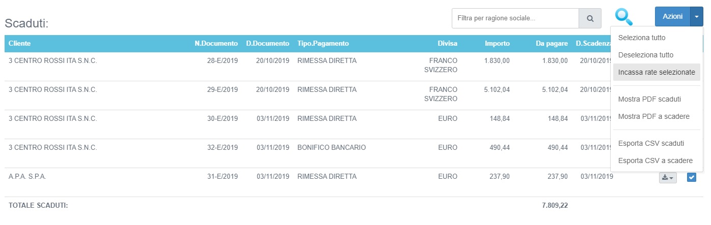 Per registrare il pagamento parziale o totale di una o più scadenze relative ad una fattura di vendita, selezionare la voce "Amministrazione" → "Scadenze" nel menù funzioni