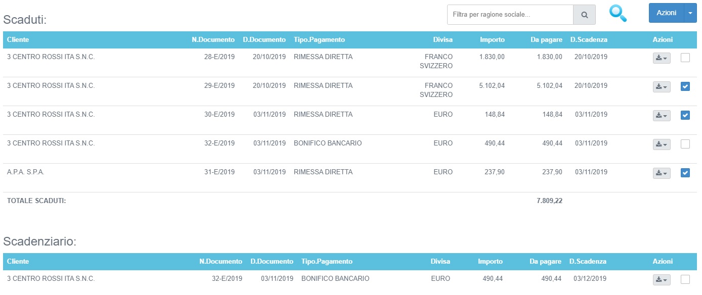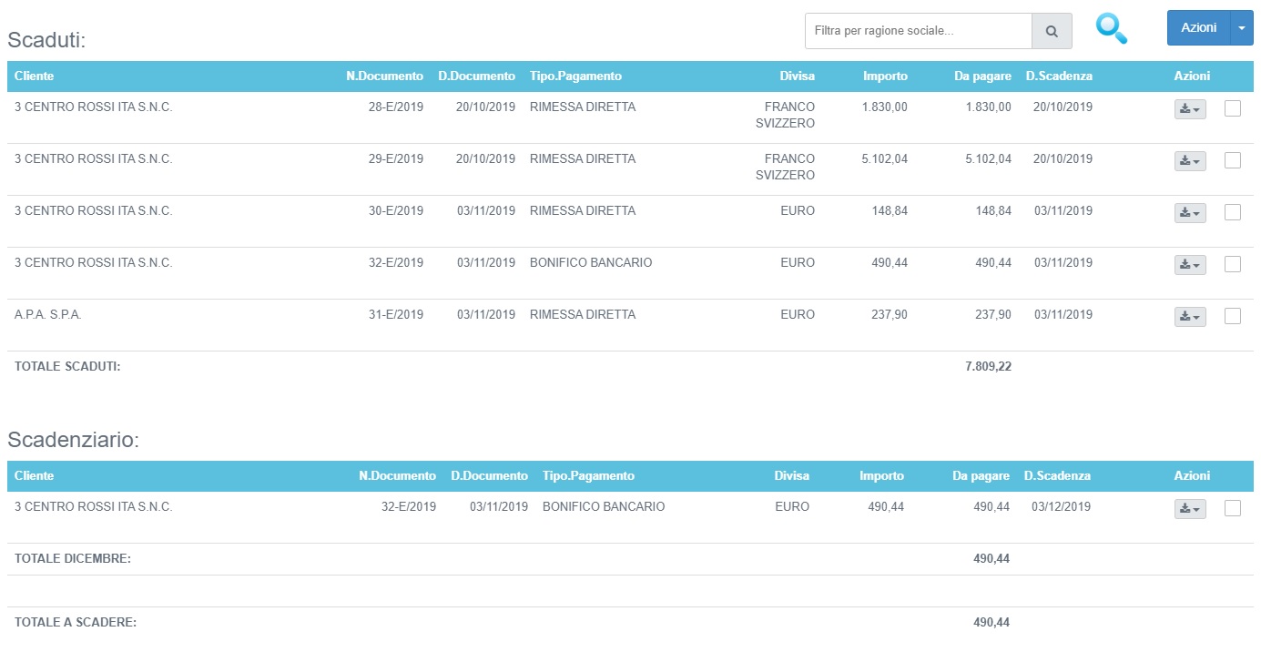 vengono mostrate le scadenze in ordine di data di scadenza e suddivise per rate scadute e rate a scadere(raggruppate per mese):
