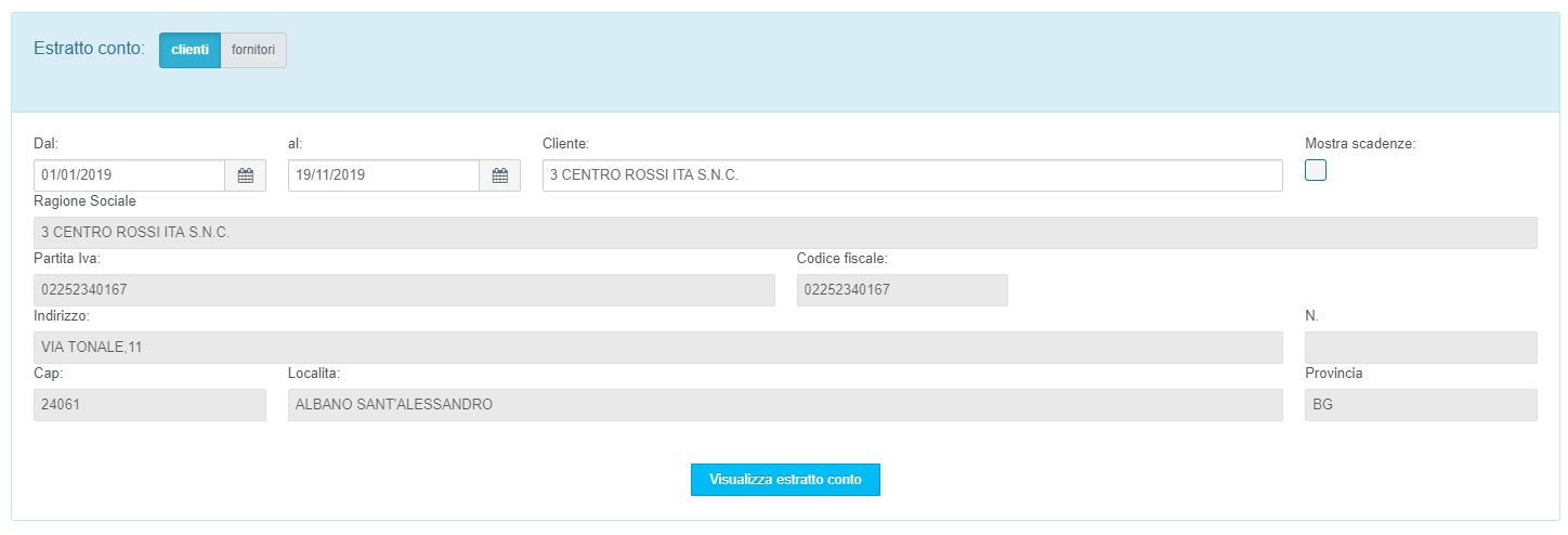 Per ottenere l'estratto conto selezionare la voce "Amministrazione" → "Estratto conto clienti/fornitori" nel menù funzioni