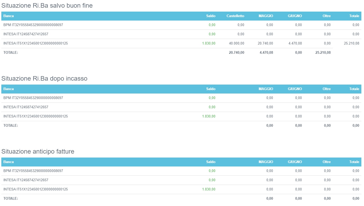 situazione delle scadenze Ri.Ba presentate al dopo incasso o al salvo buon fine oltre l'eventuale situazione di anticipo fatture.