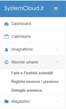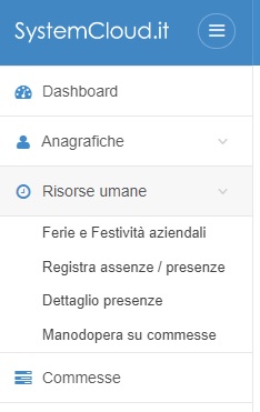 Per impostare le chiusure aziendali per ferie e vestività da applicare a tutti i dipendenti la voce Risorse Umane → Ferie e Festività aziendali nel menù funzioni: