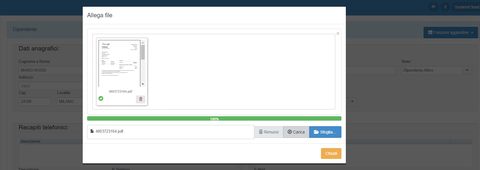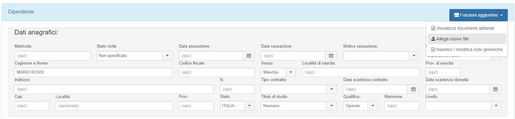 Per effettuare l'upload dei file selezionare l'anagrafica dipendente desiderata in modalità Modifica e cliccare sul pulsante Funzioni aggiuntive → Allega nuovo file