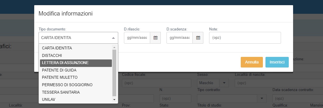 Il modulo estende la funzione standard di upload file all'anagrafica, nello specifico è possibile oltre all'upload del documento specificare la tipologia del documento (Es. patente muletto, certificati di idoneità, permesso di soggiorno, ecc..)