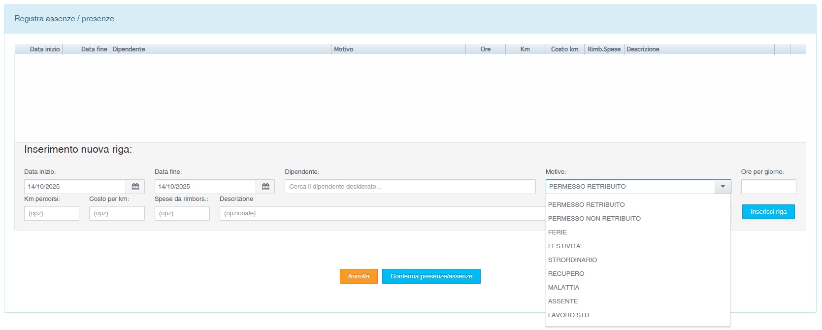 Per abbinare ad uno o più dipendenti ore di permesso, ferie, malattia o straordinario selezioniamo la voce Risorse Umane → Registra assenze / presenze nel menù funzioni: