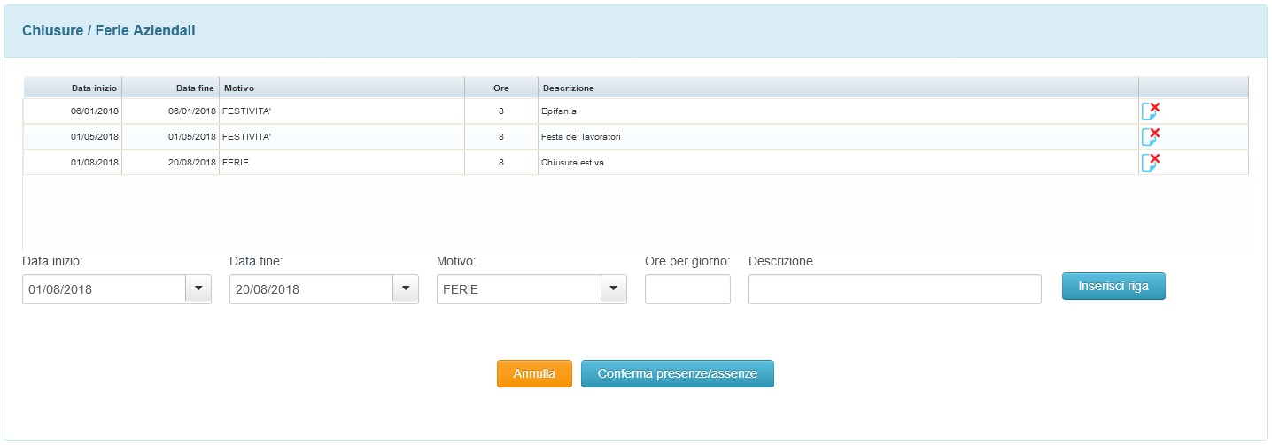 Per definire le eccezioni dovute a ferie o oltro è possbile inserire in questa area le ore realtive a: