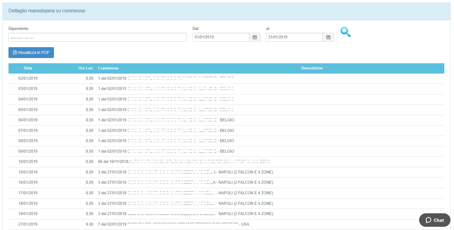 Per ogni dipendente o collaboratore è possibile ottenere il dettaglio delle ore lavorate giornalmente complete di riferimento alla commesse abbinata,