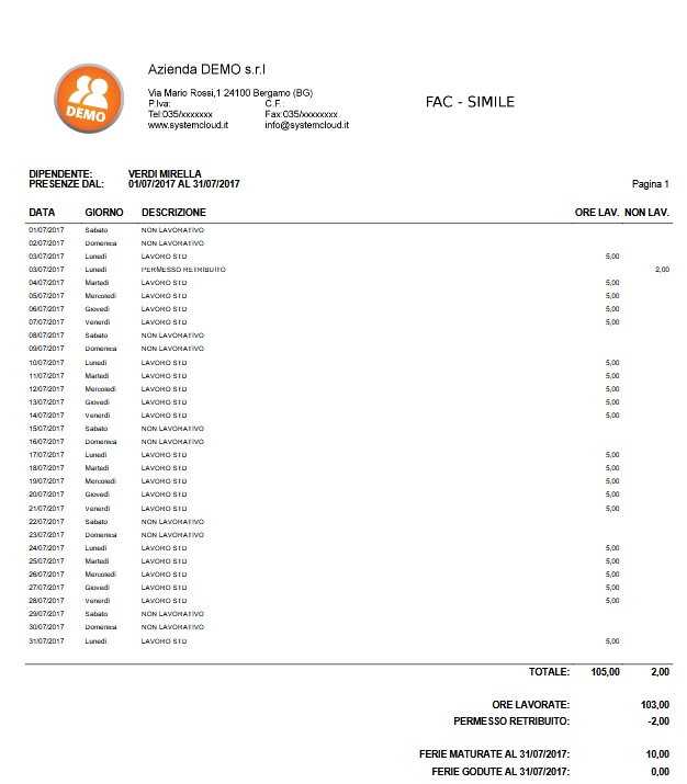 Questo modulo consente di calcolare le presenze mensili dei propri dipendenti e di generare il monte ore di ferie e permessi maturati e non goduti.