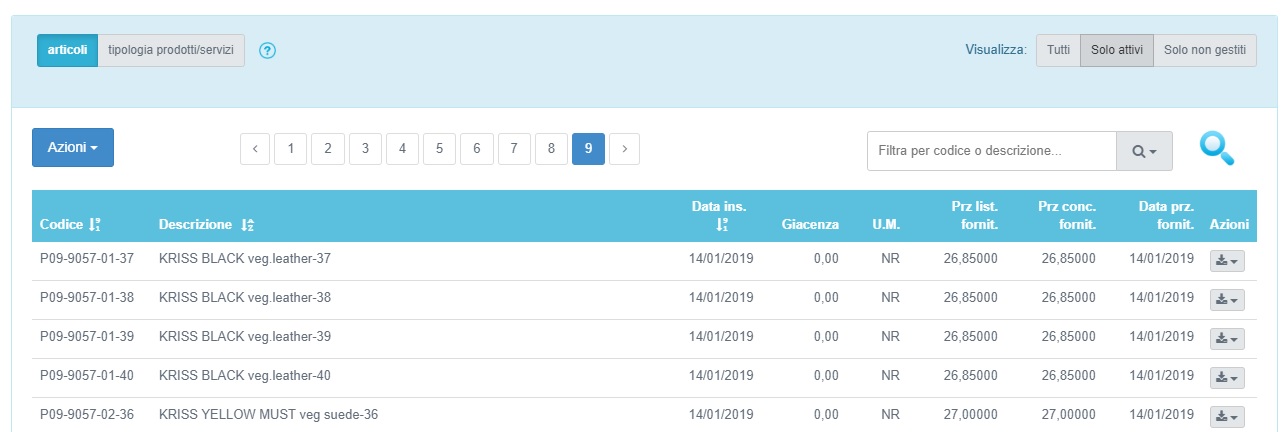 Nella parte superiore a destra possiamo filtrare gli articoli presenti: