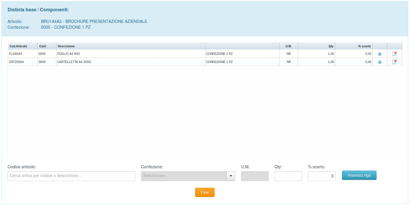 La schermata permette di visualizzare,inserire e modificare la lista dei componenti che formano l'articolo: