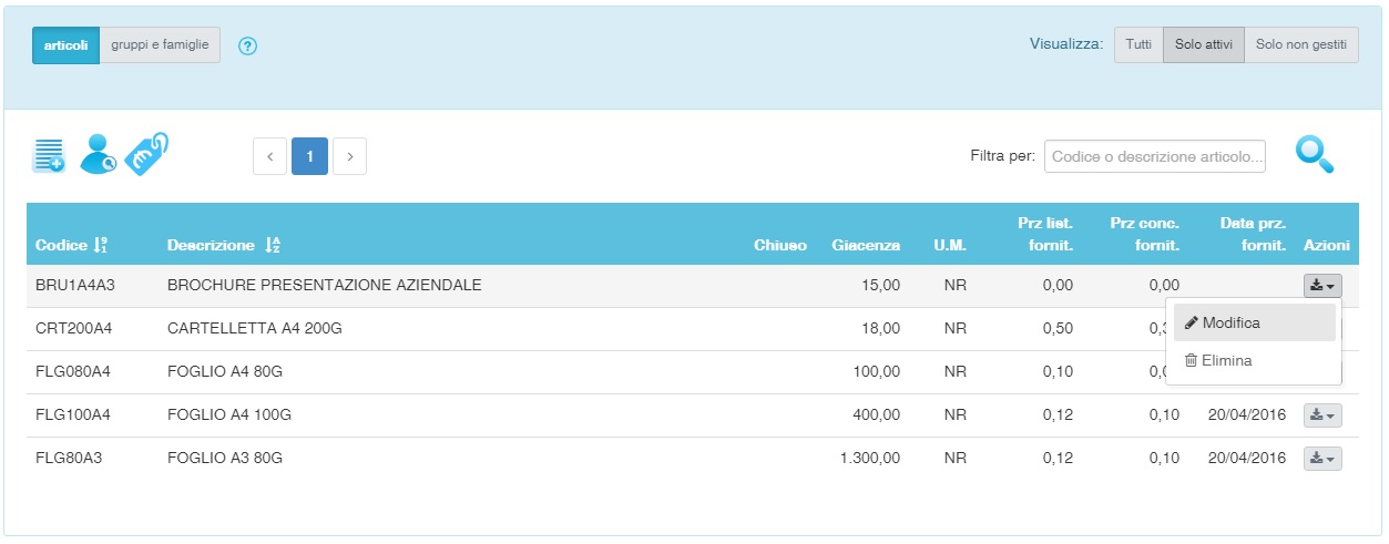Per modificare un articolo selezionare "Magazzino" → "Articoli" nel menù funzioni