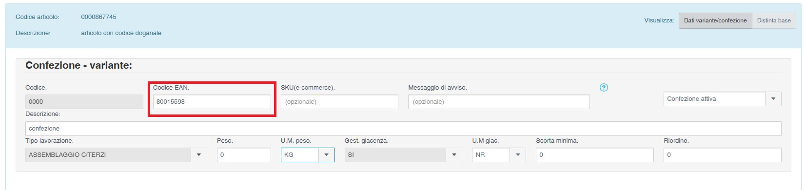 Per prima cosa è necessario completare l'anagrafica dell'articolo (se modulo Confezioni articolo non attivo) o della variante (se modulo Confezioni articolo attivo ) con il codice EAN presente sulla confezione: