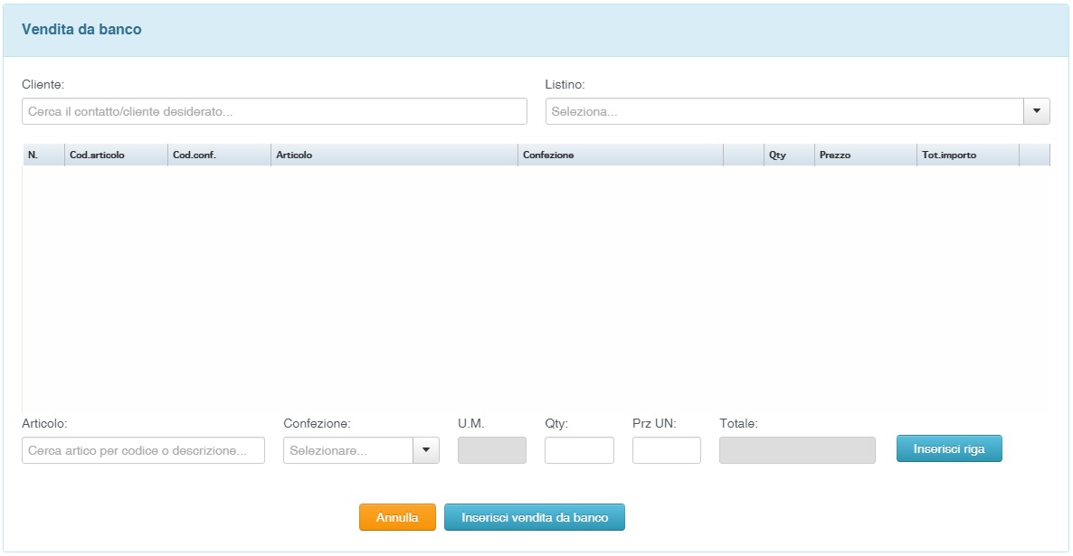 E' possibile inserire una nuova vendita attraverso il pulsante Crea nuova vendita da banco