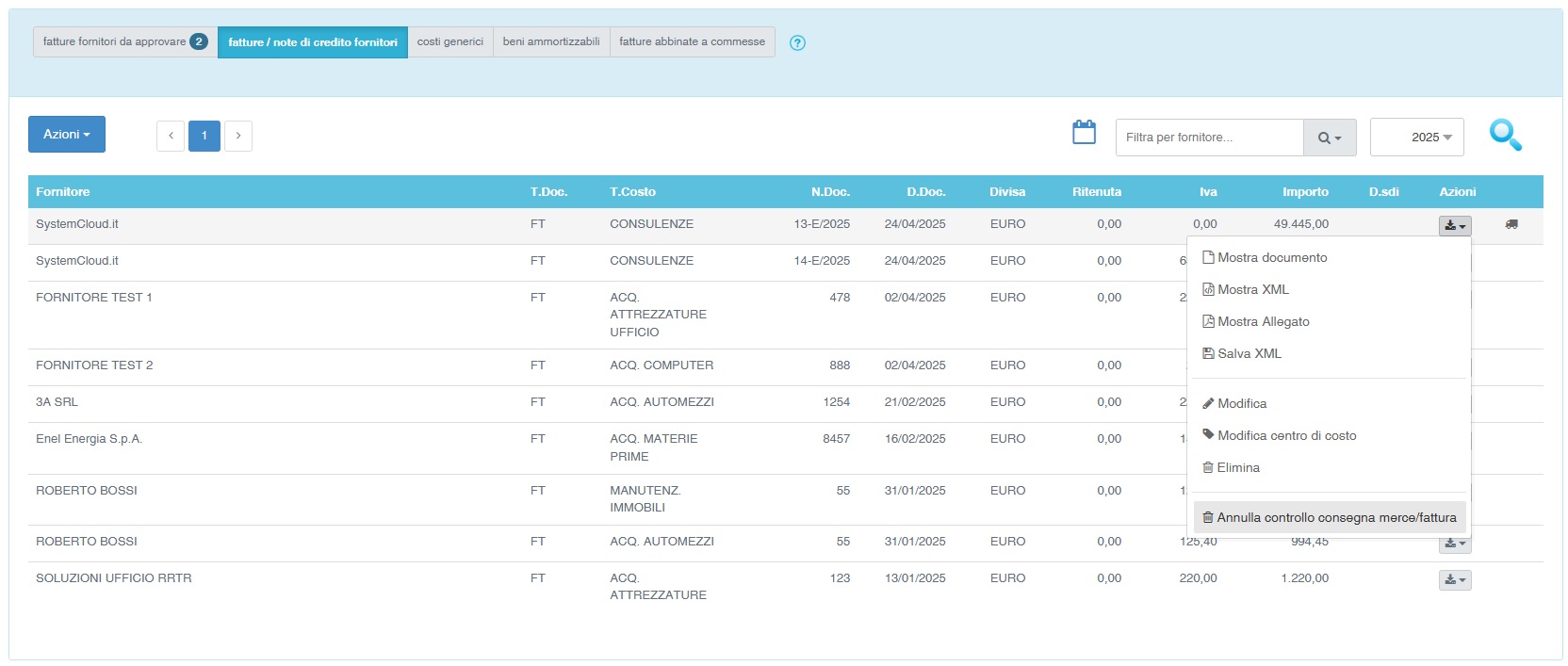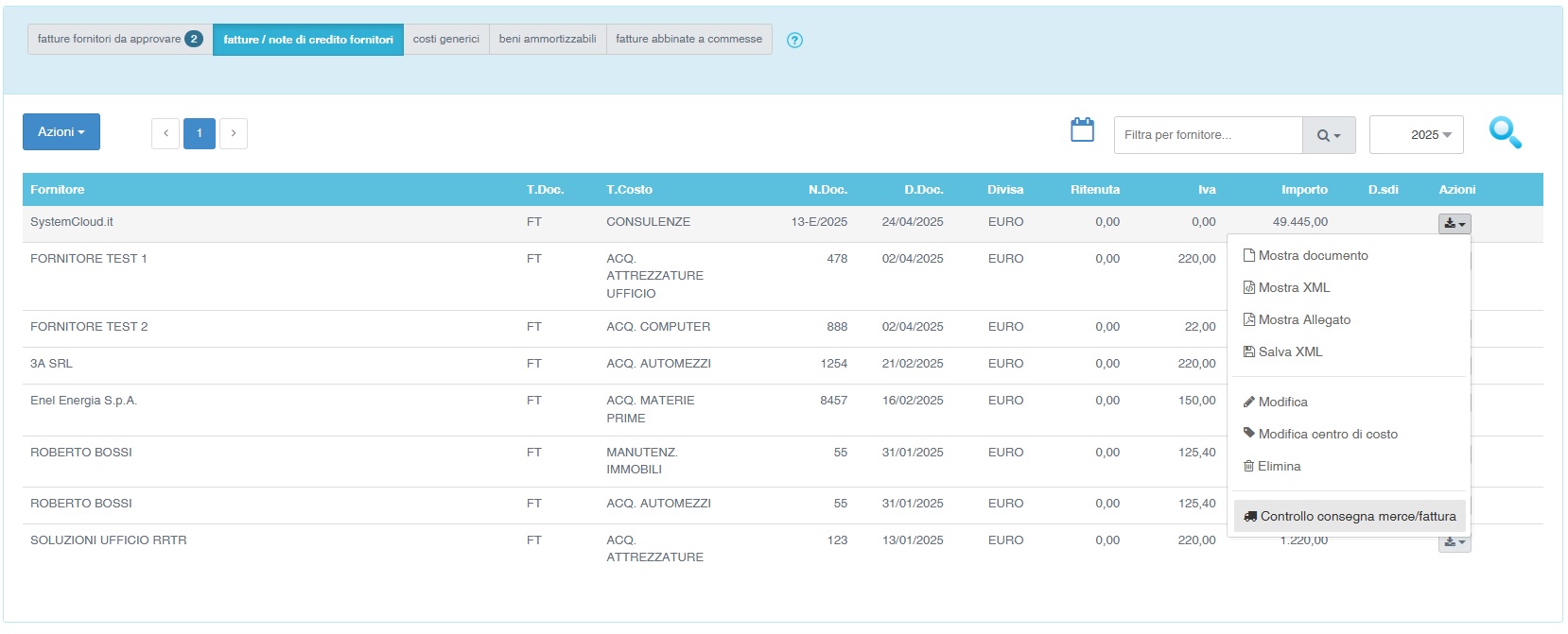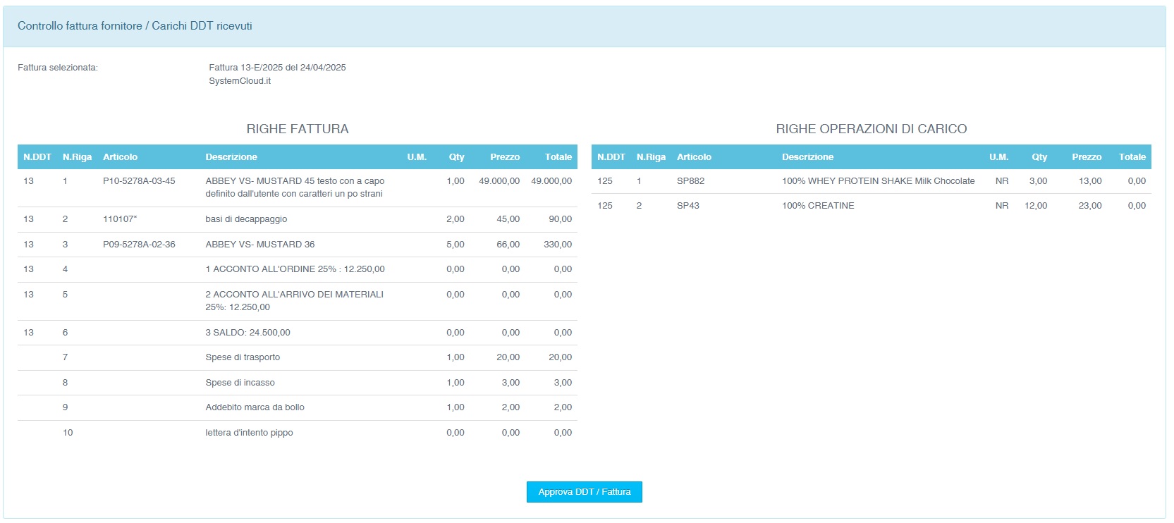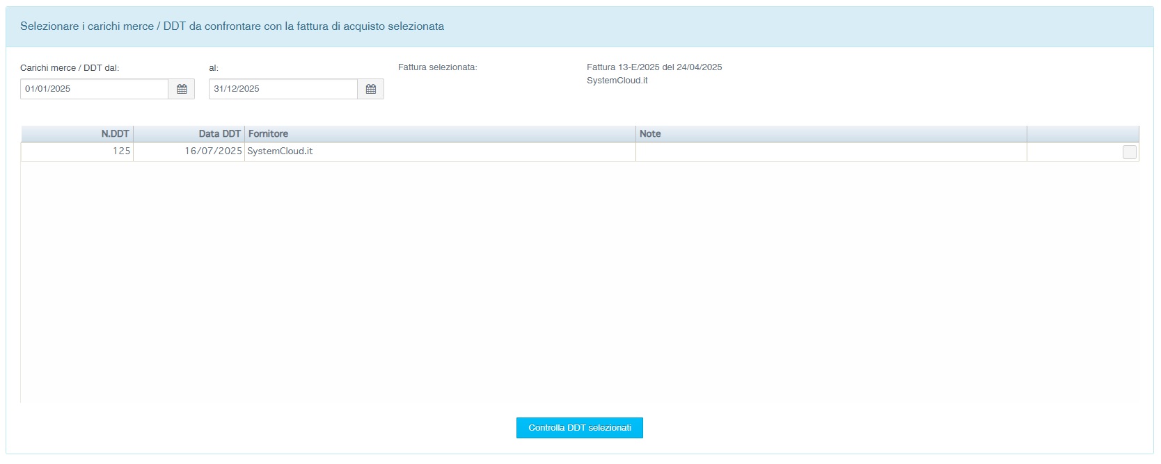 La funzione permette di confrontare gli articoli presenti in una fattura con i DDT del medesimo fornitore ricevuti nel periodo.