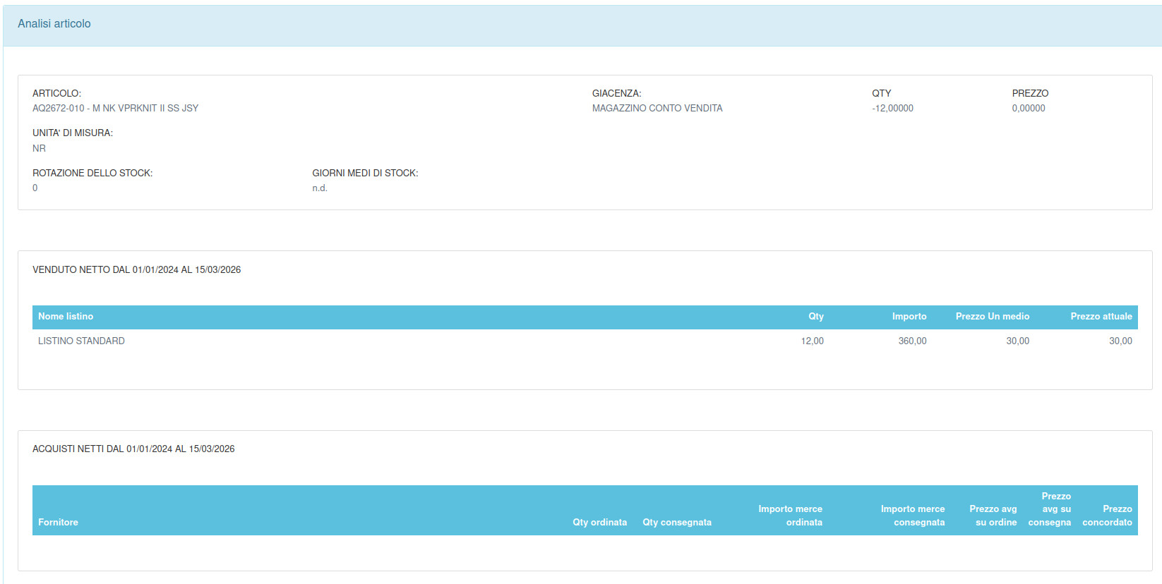 La sezione Analizza presente nel menù azioni di ogni articolo di magazzino, con l'attivazione del modulo Magazzino-PRO si completa di ulteriori informazioni rappresentate dal calcolo della rotazione di stock, dei giorni di giacenza medi dello stock e l'evidenza delle ultime 10 offerte fornitori ricevute.