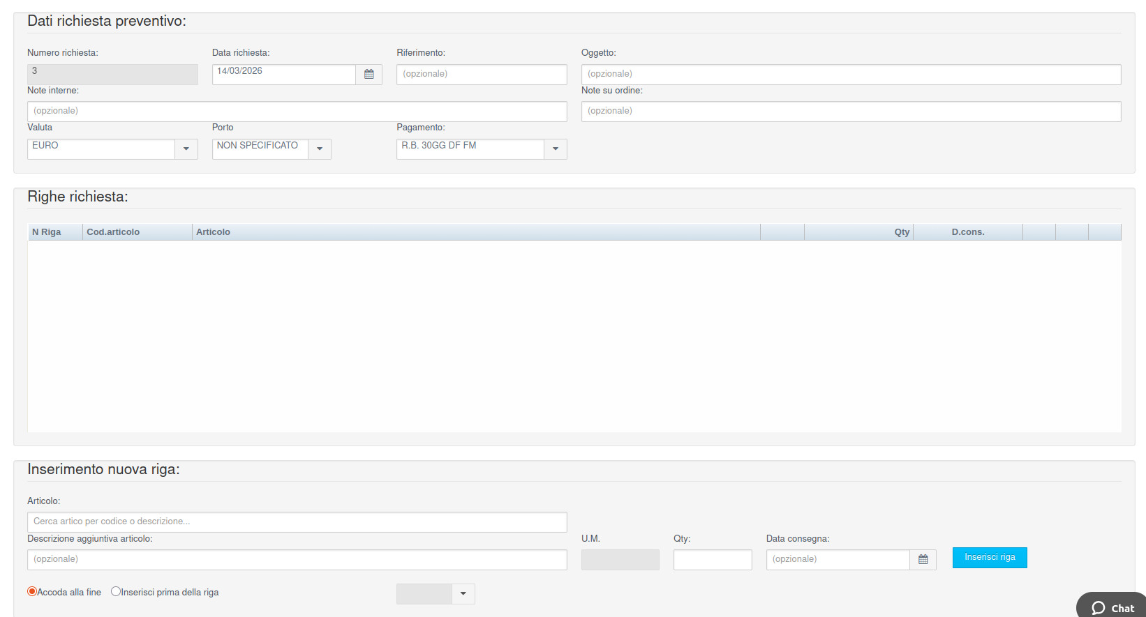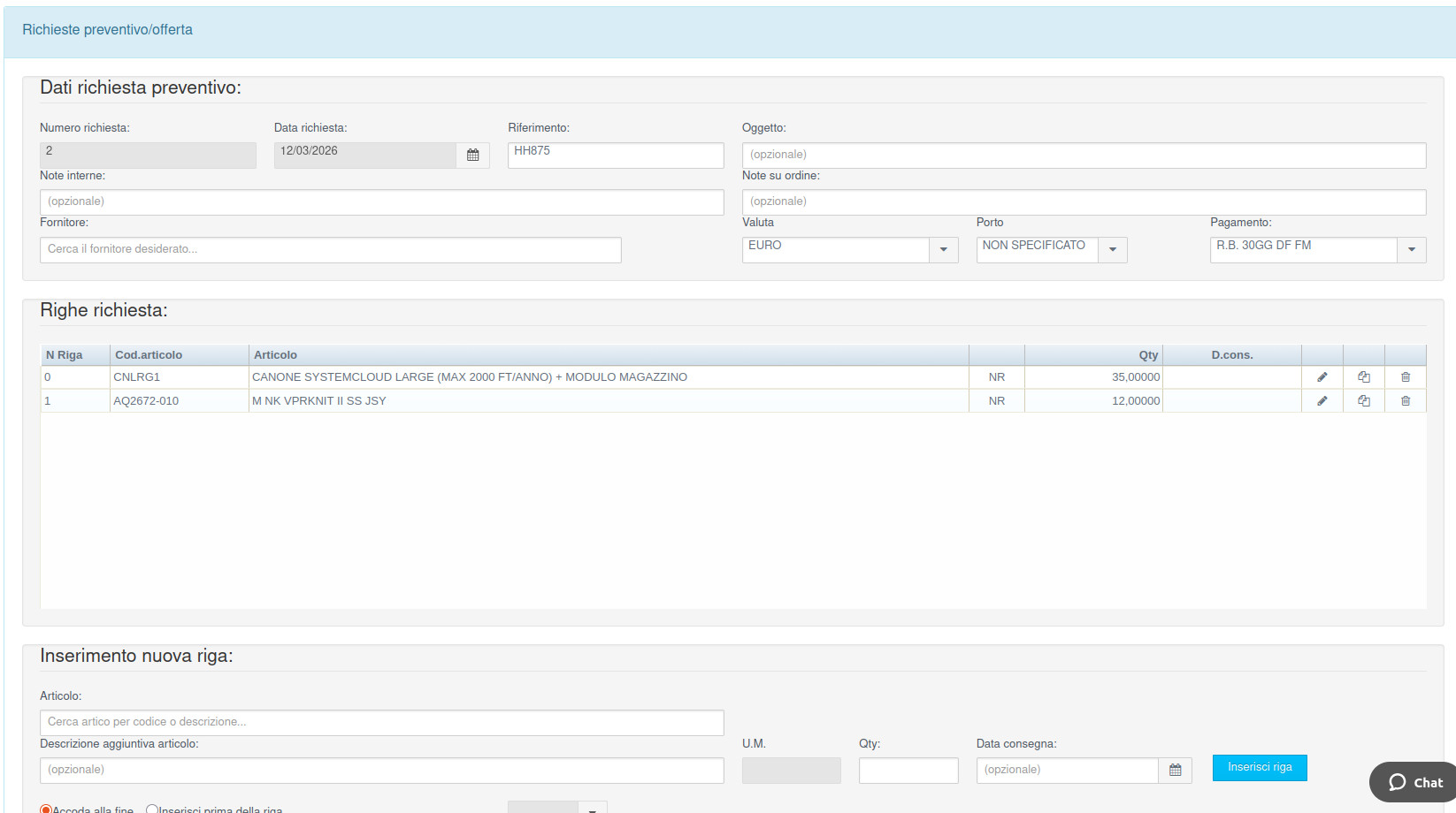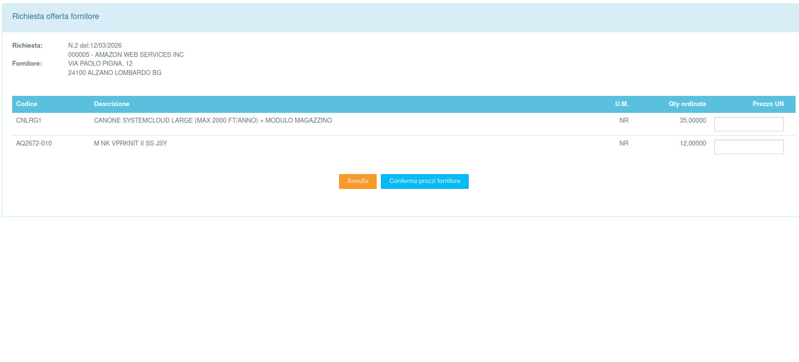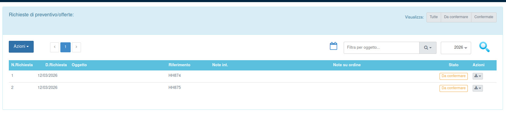 Questa funzione permette di inserire le richieste di fornitura da sottoporre ai fornitori di interesse in modo da ottnere per ognuno di essi un'offerta di fornitura in modo da valutarne la possibilità di fornitura entro le tempistiche desiderate e la possibilità di valutare l'offerta economica migliore.