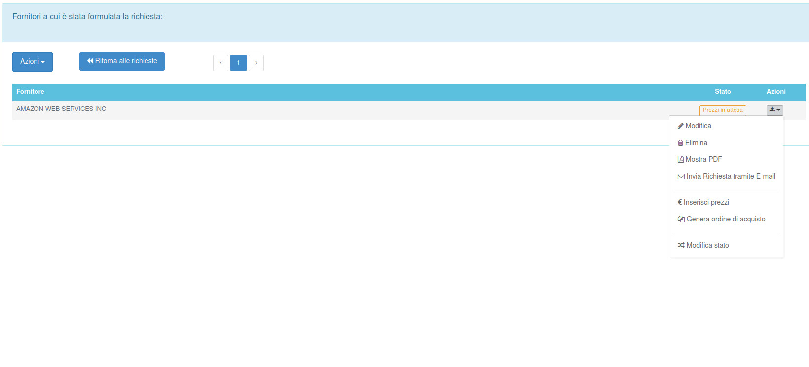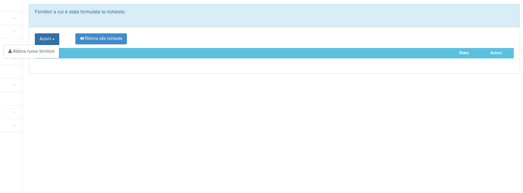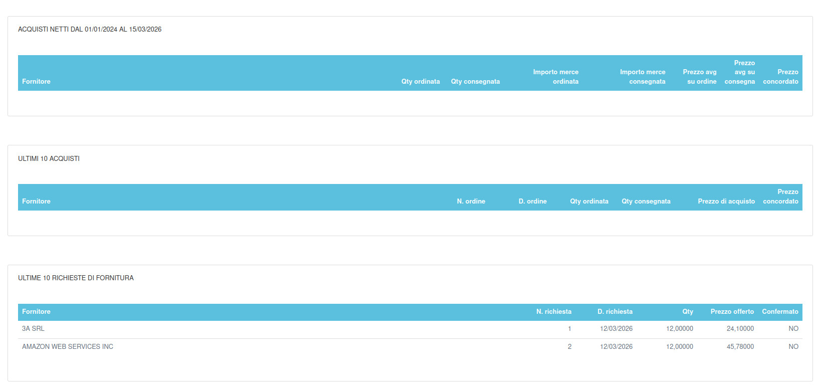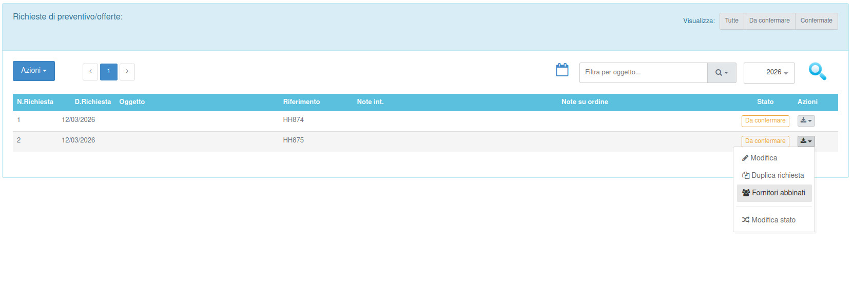 Questa funzione permette di inserire le richieste di fornitura da sottoporre ai fornitori di interesse in modo da ottnere per ognuno di essi un'offerta di fornitura in modo da valutarne la possibilità di fornitura entro le tempistiche desiderate e la possibilità di valutare l'offerta economica migliore.
