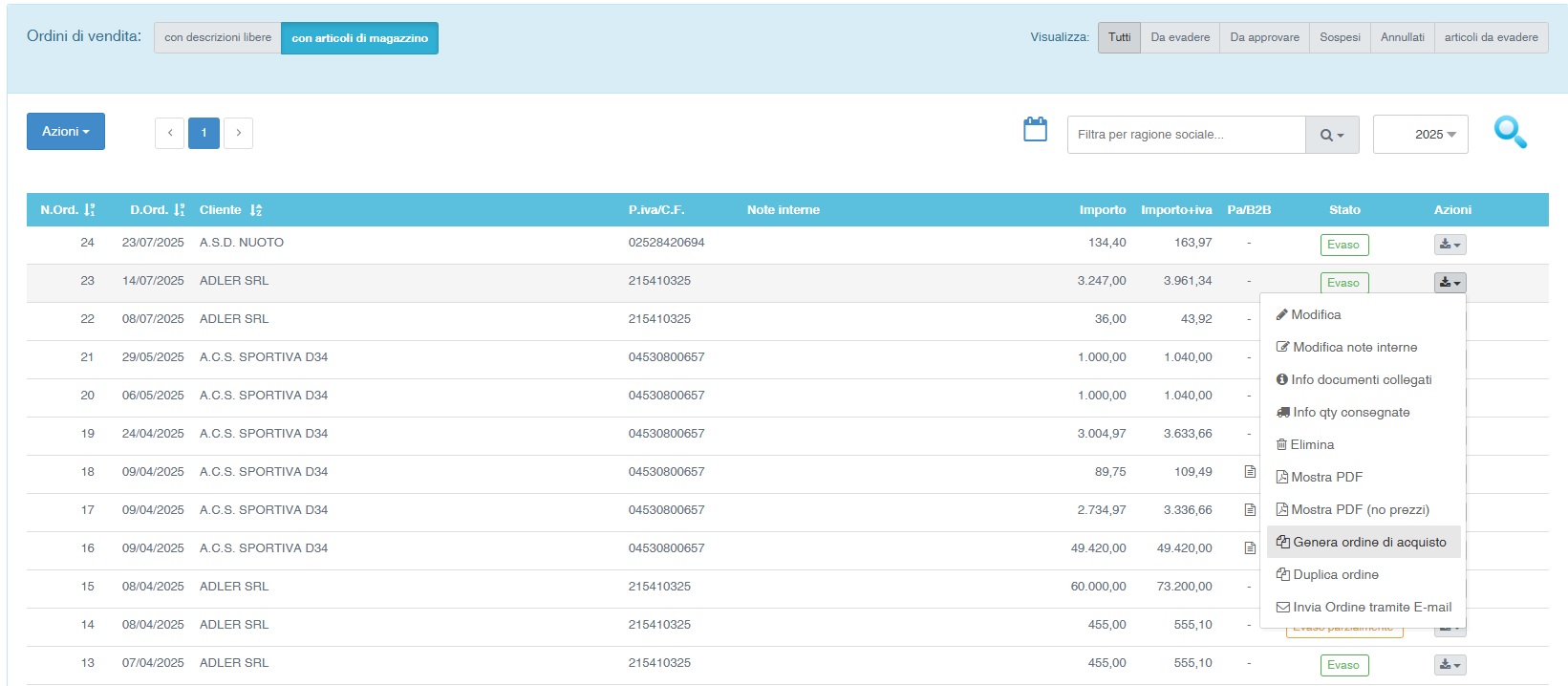 Per generare un ordine a fornitore da un ordine di vendita selezionare il menù azioni di un ordine di vednita presente a sistema e selezionare la voce: "Genera ordine di acquisto".