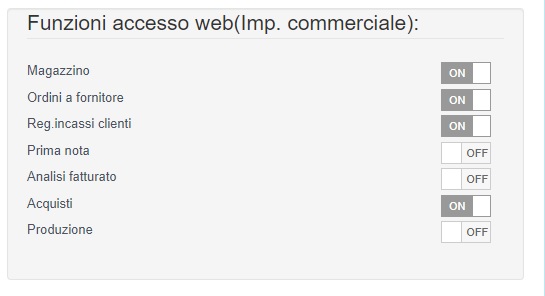 E' possibile modificare i privilegi d'accesso alle varie funzioni disponibili entrando in modica sull'anagrafica e agire sui selettore ON/OFF relativo alle funzioni desiderate: