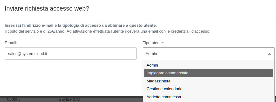Nella schermata di richiesta indicare una e-mail valida e il tipo di privilegio assegnato all'utente e premesi SI per inviare la richiesta.