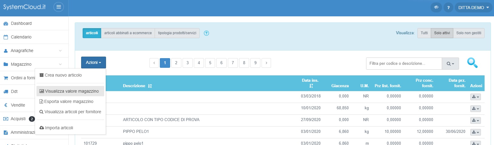 selzioniamo im pulsante Azioni e selzioniamo il pulsante Visualizza valore magazzino per ottenre il dato in formato PDF o
