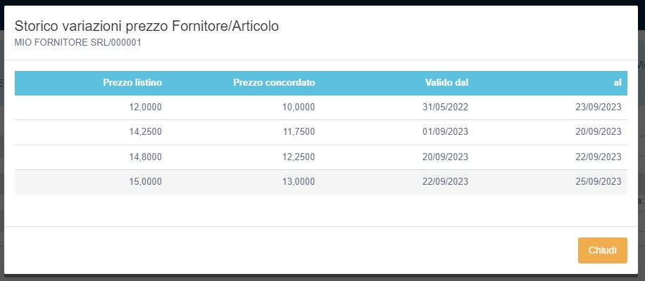 Per ogni articolo è possibile visualizzare il dettaglio storico di tutte le variazioni prezzo di acquisto che uno o più fornitori hanno effettuato.