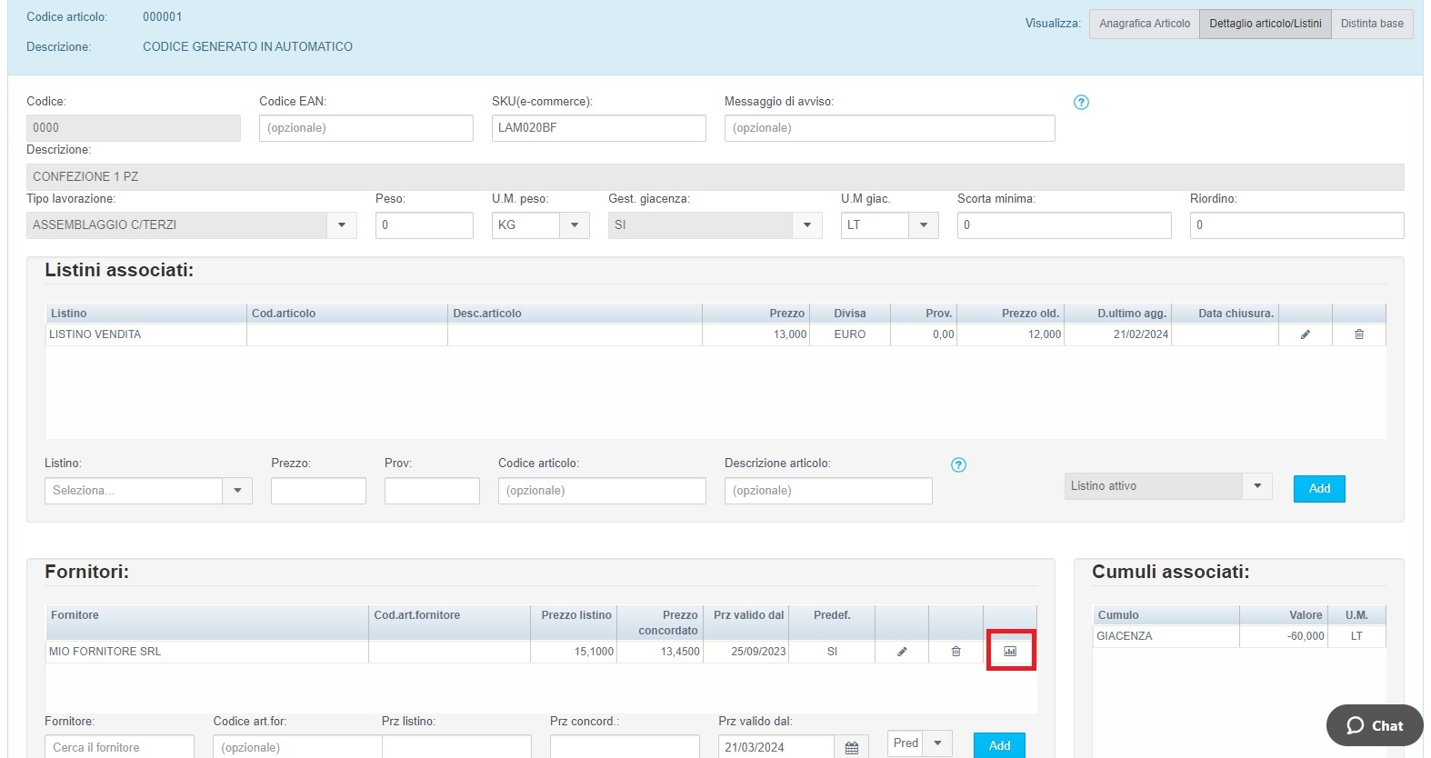 Per accedere a questa informazione è suffciente selezionare l'articolo di riferimento in modifica e nella sezione Dettaglio articolo/Listini cliccare sull'icona evidenziata dal quadrato rosso nella sezione fornitori