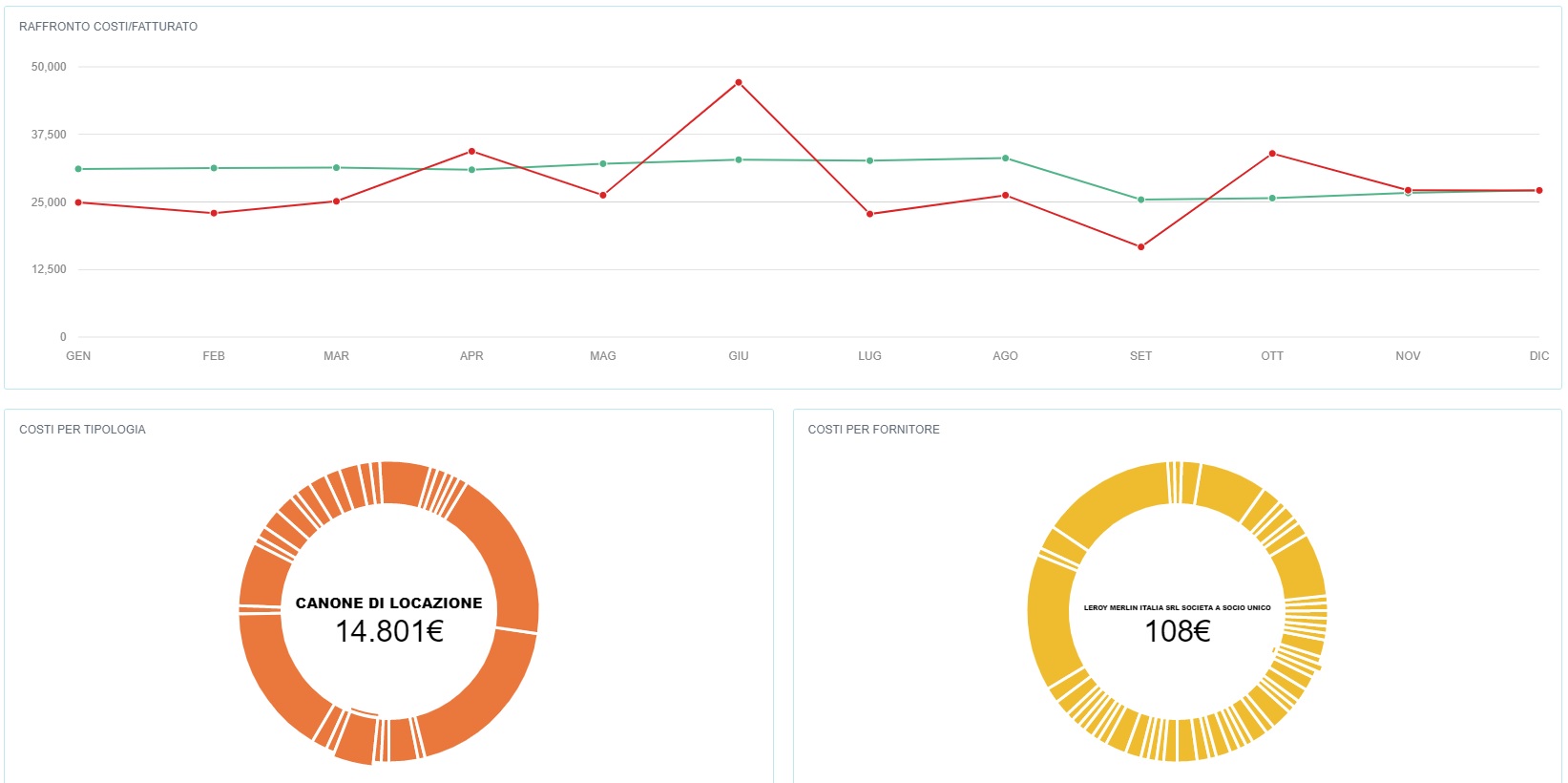 Dal menù Statistiche → Costi o cliccando direttamente sul valore di costo in Dashboard è possibile visualizzare l'analisi sui costi annui o mensili rapportati al fatturato dello stesso periodo.