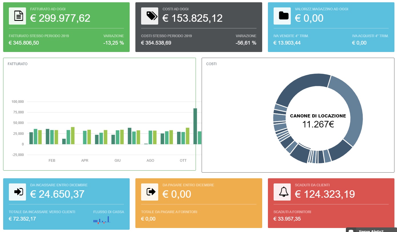 La dashboard permette di avere una visione d'insieme dell'andamento aziendale visualizzando i dati relativi a: