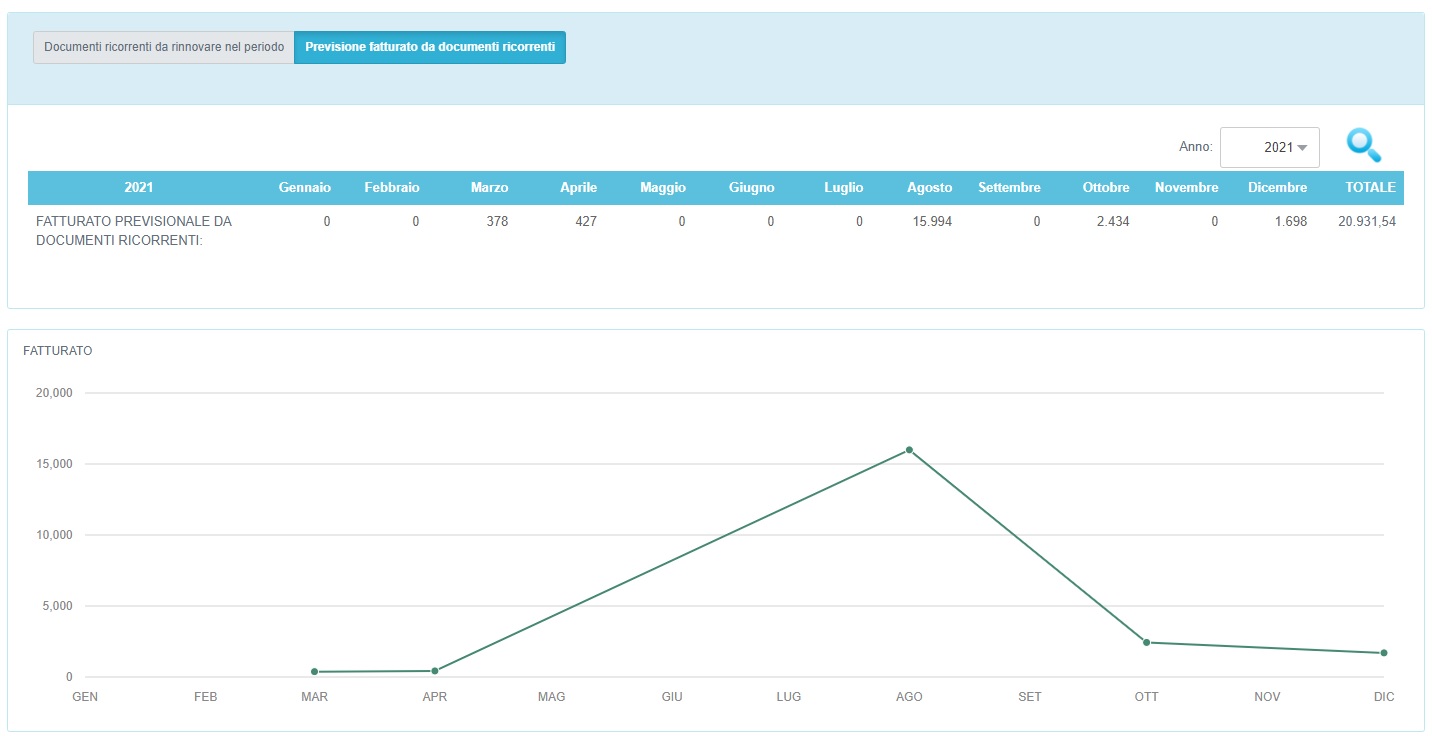 Dal menù principale possiamo selezionare la voce Vendite → Documenti → Previsione fatturato da docuemti ricorrenti e selezionando l'anno di interesse è possibile il fatturato potenziale che verrà