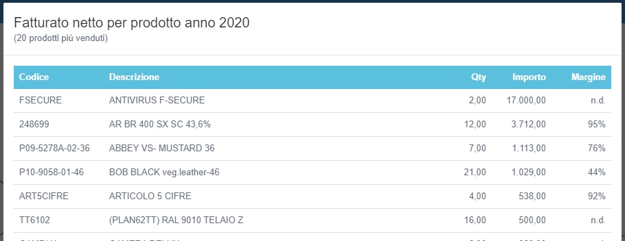in ordine decrescente di fatturato completa di margine rispetto al costo d'acquisto: