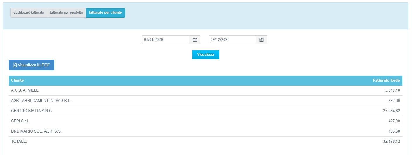 Dal menù principale possiamo selezionare la voce Statistiche → Fatturato → Fatturato per cliente, selezioniamo il periodo d'interesse e clicchiamo su visualizza per ottenere la lista dei clienti ordinati