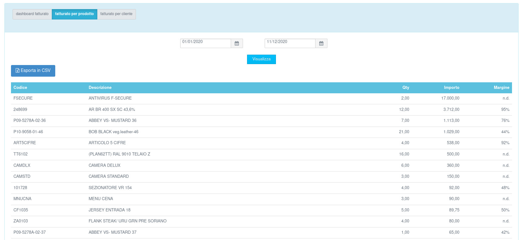 Dal menù Dal menù Statistiche → Fatturato → Fatturato per prodotto selezioniamo il periodo d'interesse e clicchiamo su visualizza per ottenere la lista degli articoli