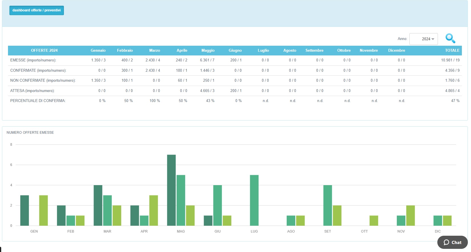 Dal menù principale possiamo selezionare la voce Statistiche → Offerte / Preventivi per analizzare il totale delle offerte emesse, sia in termini di numero che di importo, raffrontando la percentuale di quest'ultime che sono divenute vendite effettive.
