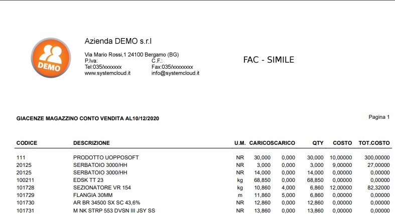 Il report mostra tutti gli articoli con giacenza diversa da zero, totale movimenti di carico / scarico e la