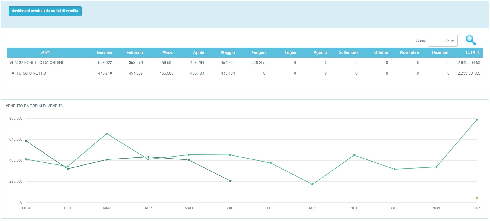 Dal menù principale possiamo selezionare la voce Statistiche → Venduto da ordini per confrontare su base mensile il valore del venduto ricavato dagli ordini di vendita inseriti, con le fatture effettivamente emesse.